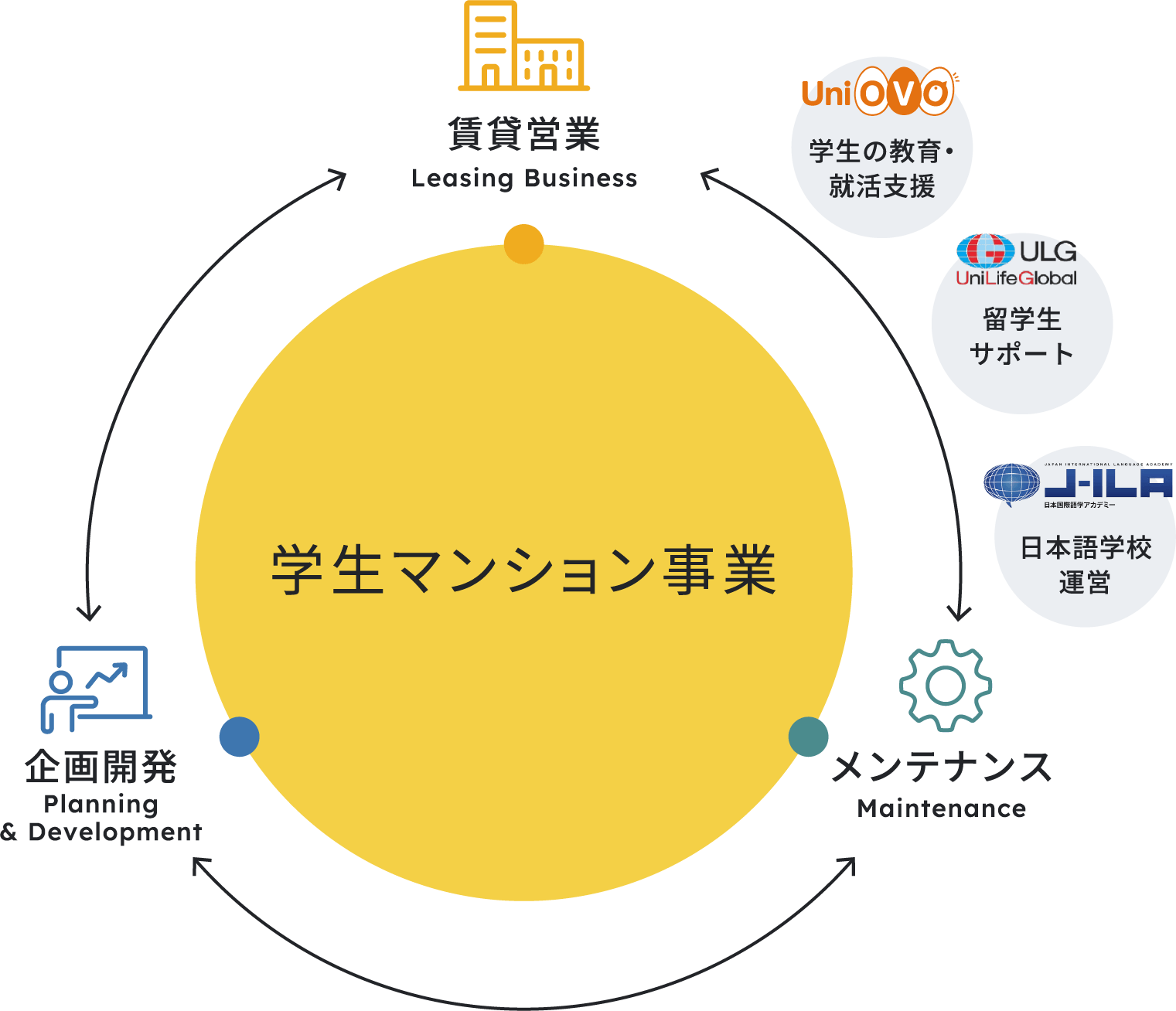 これらの新たな挑戦は、主軸である「学生マンション事業」の更なる基盤強化につながると共に、『学生』へは「安全・快適・充実した学生生活全般」のサポート、『親御様』へは親御様に代わって遠く離れるお子様の「安心・安全」、『オーナー様』へは学生マンション事業による「資産価値の向上・長期安定経営」、を提供する礎となり、皆様に今まで以上の『満足』と『喜び』を実現できると確信しています。