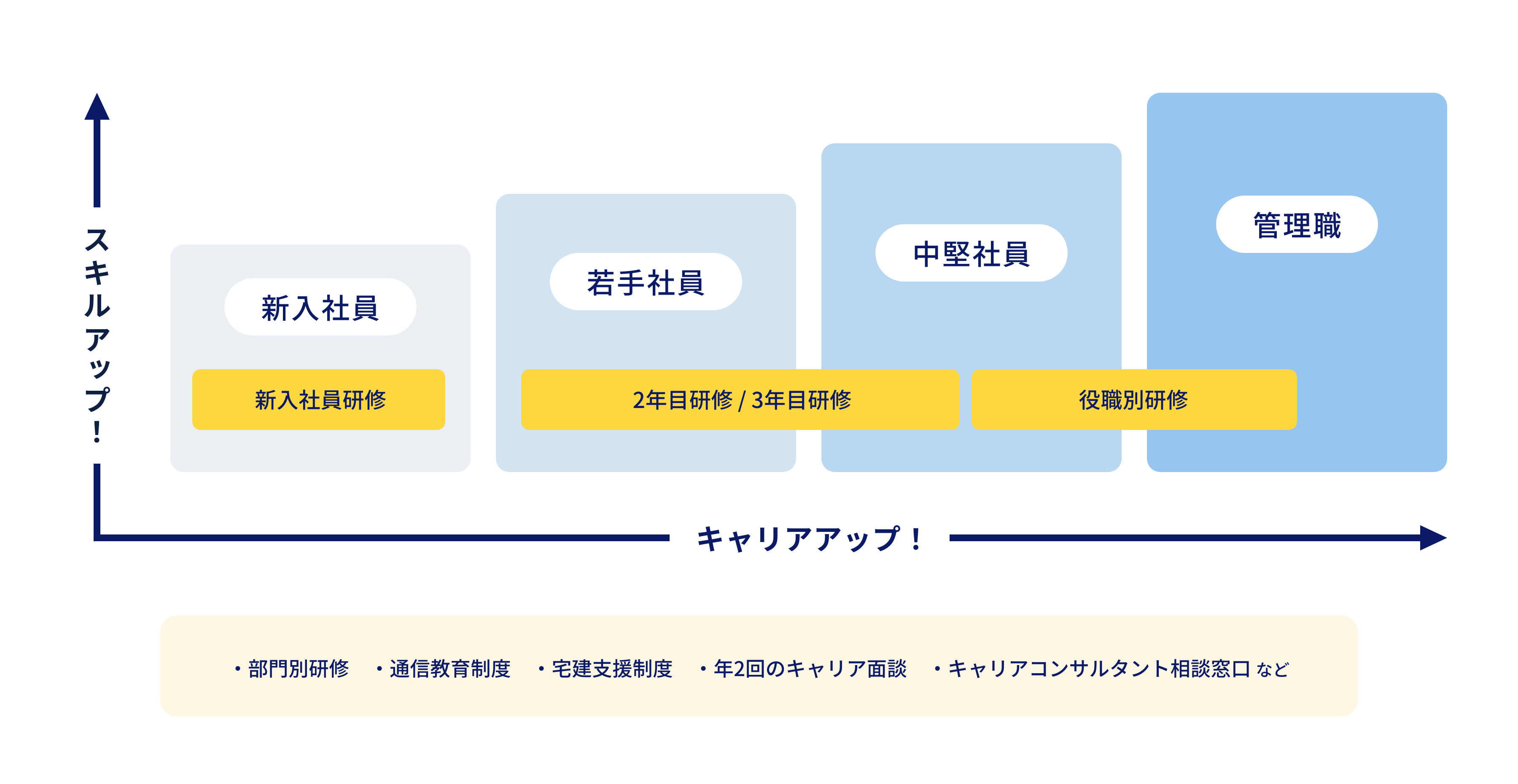 社員一人ひとりのキャリア形成を支えるため、充実した研修制度を整えています。あなたのライフステージや目指すキャリアに合わせて、成長の機会を提供します。