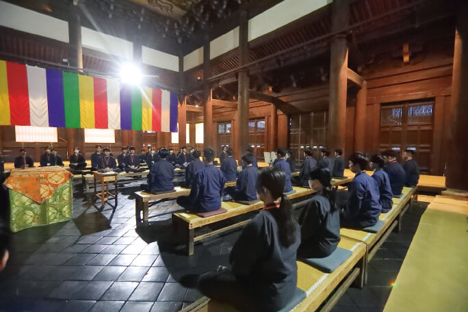 入社直後、春の新入社員研修では、京都の大本山妙心寺にて集合合宿を毎年行っています。学生から社会人へのスイッチの切り替えを行うとともに、J.S.B.の一社員に加わる上で必要な心構えや知識を習得します。