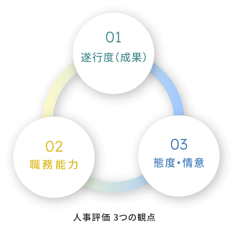 人事考課は年2回。自身の職務について、❶遂行度(成果)、❷職務能力、❸態度・情意の3つの観点から自己評価および上席評価をおこなっています。また、上席からのフィードバックを義務付けており、現状の仕事の内容や量、モチベーションについてのアドバイスを受けることはもちろん、部署や地域の異動について自身の希望を相談する機会となっています。