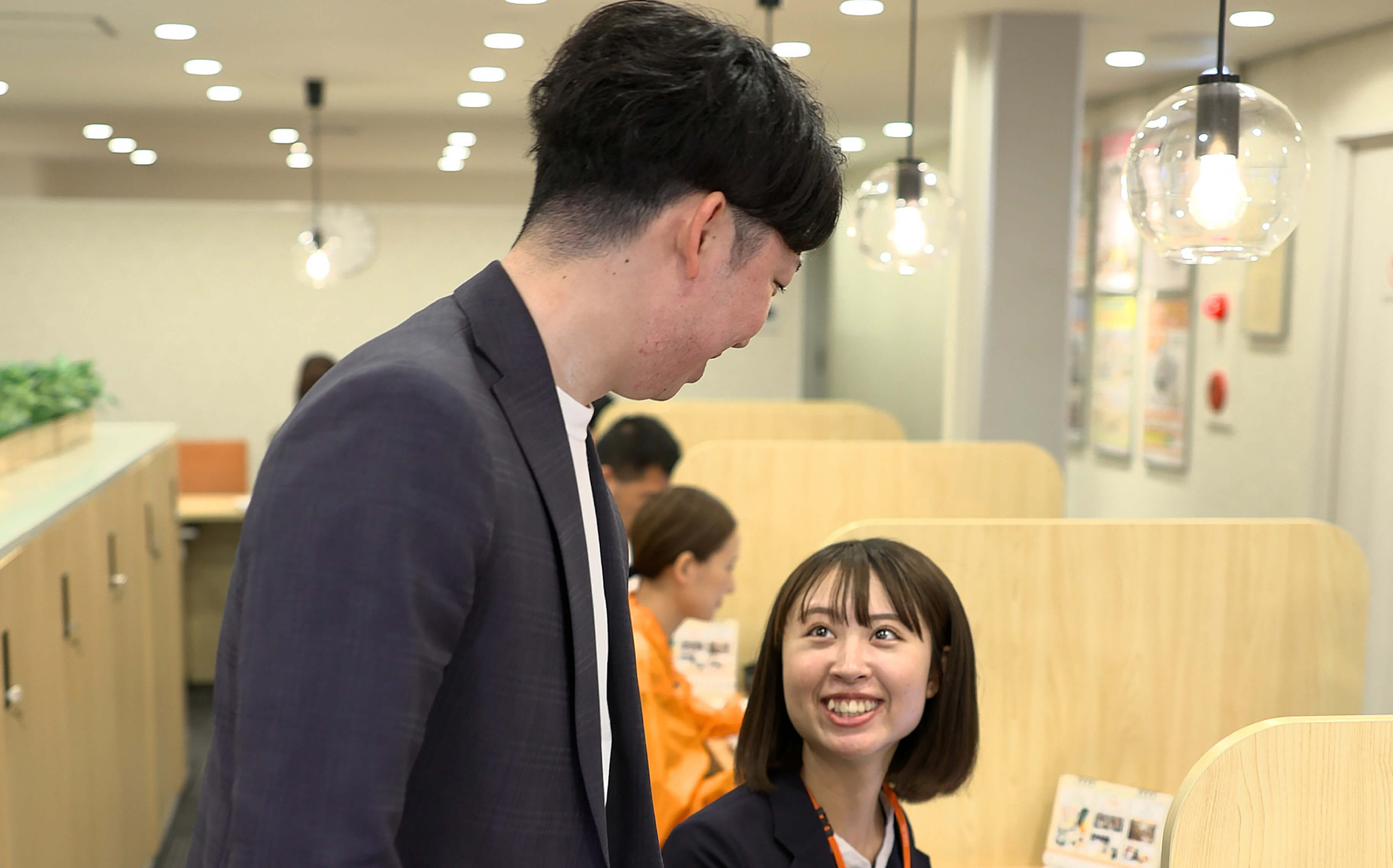 10月~3月の期間に、内定者研修を兼ねた“内定者アルバイト”を実施しています。ユニライフの各店舗・管理センターで、お客様への物件案内・現場対応など、実際の業務を体験していただく機会です。